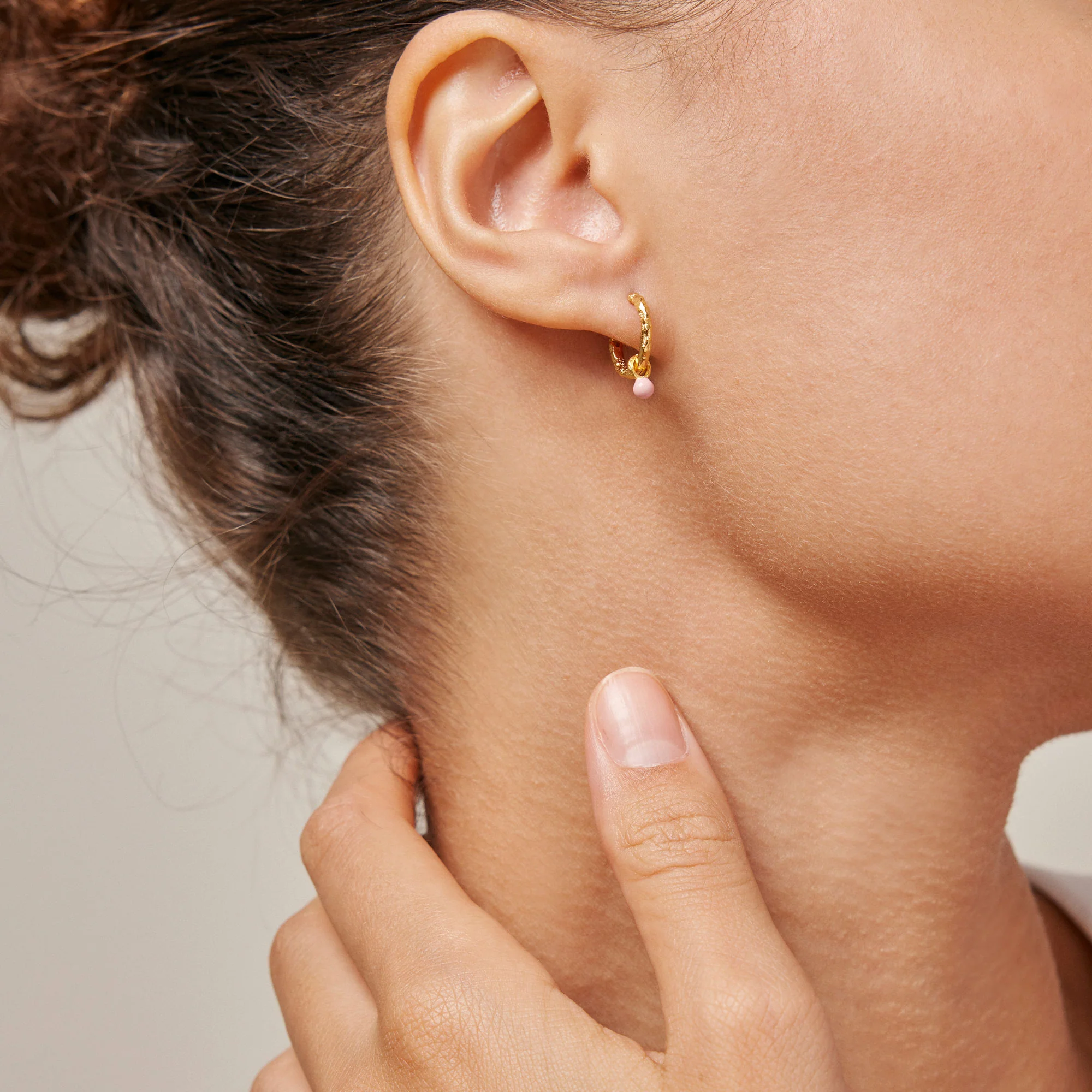 Indfør en subtilt charmerende tone til din stil med vores Belle hoop Øreringe i lyserød. Den delikate emaljefinish smelter sammen med den rå hoop på en legende måde. Den lyserøde emaljekugle giver en fornemmelse af lethed til dine outfits. Gå fra sød til cool ved at fjerne kuglen og fremhæv den rene hoop.